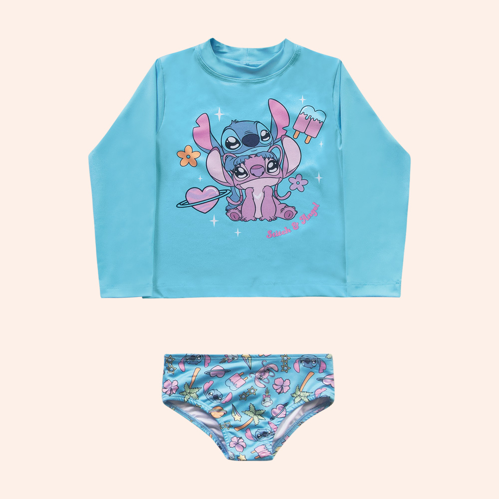 Conjunto com blusa de manga longa e calcinha com estampa do Stitch. Modelagem confortável em cotton poliéster com proteção UV50+, pensado para os dias de sol com liberdade e segurança para as pequenas.